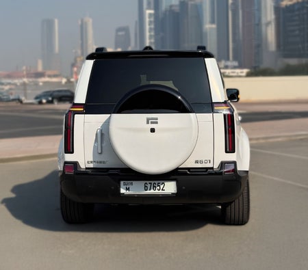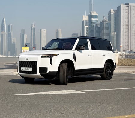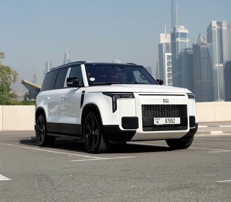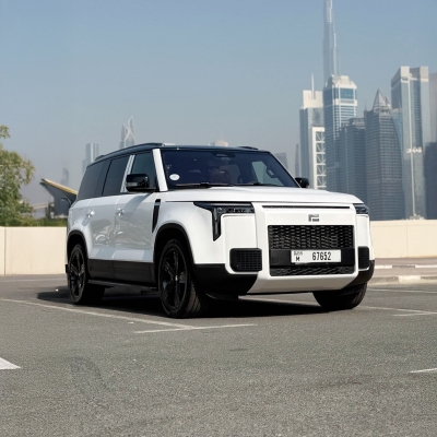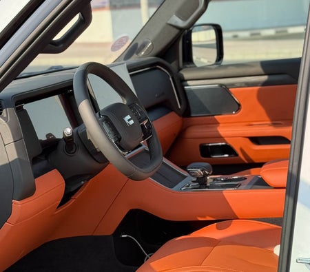 للإيجار في دبي: سيارة دفع رباعي كهربائية لون أبيض، 5 مقاعد، تصميم مبتكر، نظام مساعدة قيادة ذكي، سقف زجاجي بانورامي