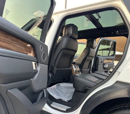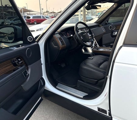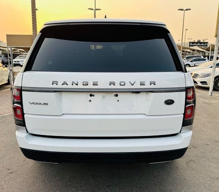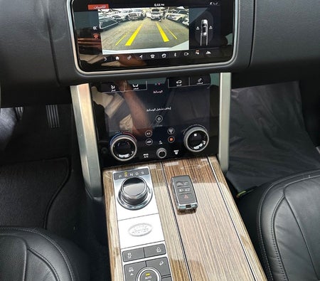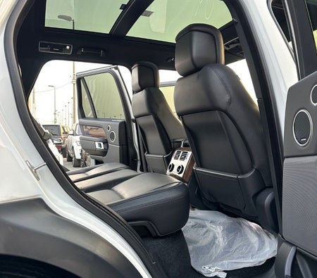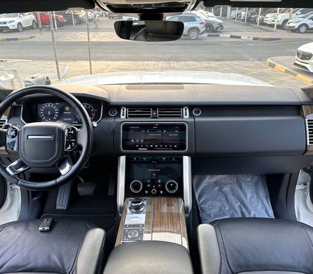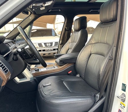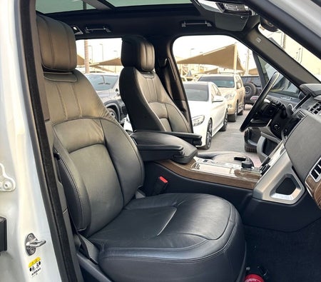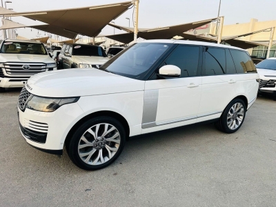Range Rover Vogue Supercharged 6cylinder Gulf, number one, full specifications, panoramic, leather, large screen, camera, fingerprint start, and blind spot. The car has only one piece of paint. The car is white with a black interior.