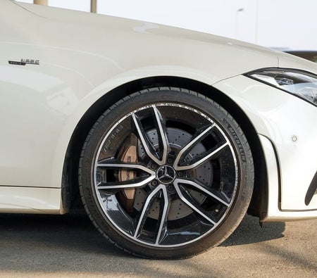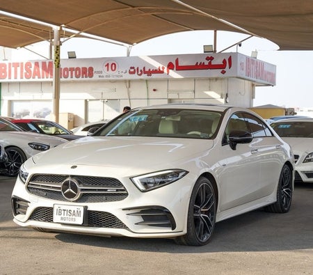 Preowned MercedesBenz CLS 53 AMG for sale in Dubai. White 2019 model, available at Ibitisam Motors. This car has automatic transmission, 6 cylinders, 20″ wheels and beige interior. 62,000 km, Japanese specs.
