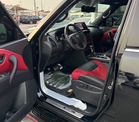 Nissan Patrol Nismo, original Gulf, number one, full specifications, leather, sunroof, large screen, camera, fingerprint start, blind spot, original paint, original checks, and the car has a warranty. The car color is black with a black and red interior.