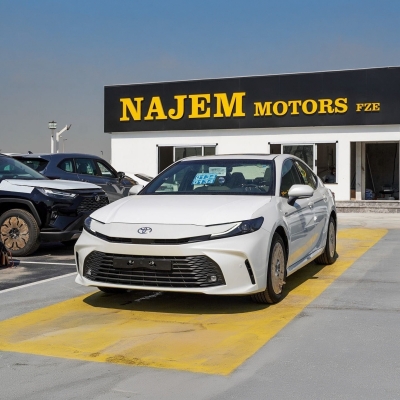 New Toyota Camry EPLUS. HEV for sale from Najem Motors FZE in Dubai. White model. The car has automatic gearbox, cylinder engine, ″ wheels and beige interior. GCC specs.