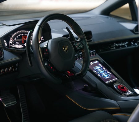 Rent and Drive this Lamborghini Huracan Evo Coupe 2021-model in Dubai, UAE  for USD 680/day & USD 14960/month. Rental cost includes basic comprehensive insurance and standard mileage limit of 250 km/day (USD 2.72 per additional km applicable). Security deposit of USD 1360 is required. Contact F10 Luxury Car Rental directly for bookings and inquiries...