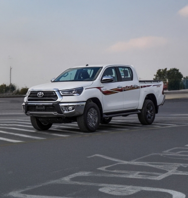New Toyota Hilux GLXS SR .L for sale from Najem Motors FZE in Dubai. White model. The car has automatic gearbox, cylinder engine, ″ wheels and burgundy interior. GCC specs.