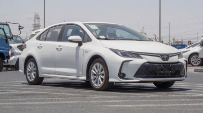 New Toyota Corolla Hybrid for sale from Najem Motors in Dubai. White model. The car has automatic gearbox, cylinder engine, ″ wheels and black interior. Chinese specs.