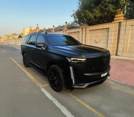 Cadillac Escalade 2021 Location à Dubai : SUV noir 7 places, système audio Bose haut de gamme, sièges capitaine, toit panoramique, grand écran tactile, confort VIP