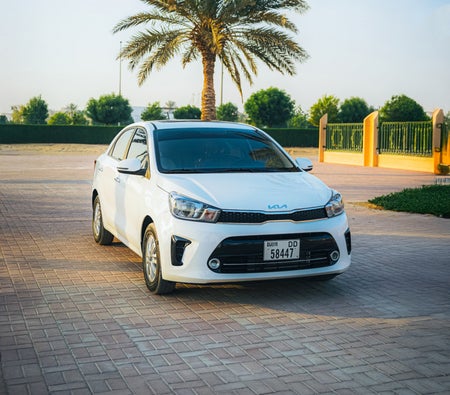 Kia Pegas 2025 Location à Dubai : Berline blanche, 5 places, cabine spacieuse, tableau de bord moderne, commandes intelligentes, sièges confortables