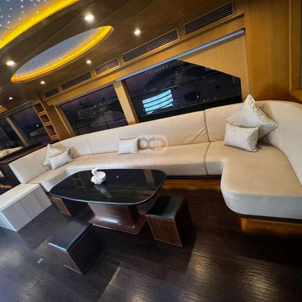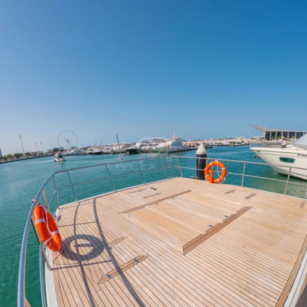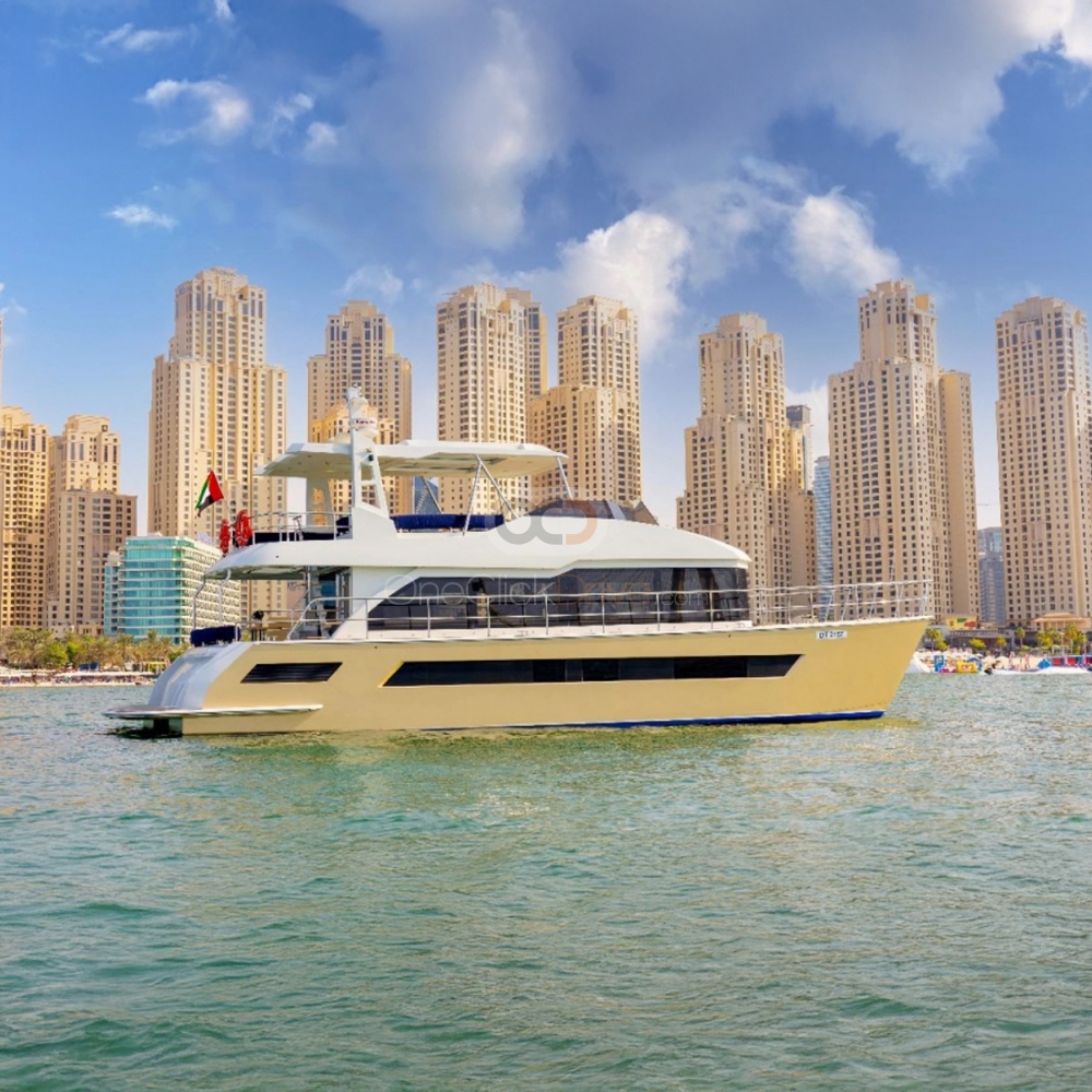 Het jacht is ontworpen om u en uw gasten een comfortabele en luxueuze ervaring te bieden terwijl u geniet van de schoonheid van het omliggende landschap en geweldige attracties verkent, zoals de torenhoge Burj Khalifa, het Atlantis Hotel en het door de mens gemaakte Palm Jumeirah. Met een lengte van 60 voeten, dit jacht biedt comfortabel plaats aan maximaal 40 gasten. De boot beschikt ook over een elegant ingericht interieur, met zachte stoelen en voldoende ruimte om te bewegen en een praatje te maken.