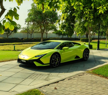 Lamborghini Huracan Evo Coupe 2022 Прокат в Дубае: желтый суперкар-купе, двухместный, атмосферный двигатель V10, молниеносное ускорение, аэродинамический дизайн.