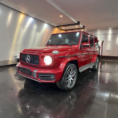 Mercedes G63 is a luxury high-performance SUV that started as the G-Class in 1979 for military use and later became a symbol of power and style, favored by leaders and royalty. This model comes in red exterior with AMG wheels, LED lights, and a panoramic roof. The interior is white Nappa leather with heated and ventilated sports seats, full electric adjustment with memory, AMG logos, ambient lighting, dual screens, Burmester sound system, and advanced navigation. It is powered by a 4.0L twin-turbo V8 engine producing 577 hp and 850 Nm torque, accelerating 0–100 km/h in 4.5 seconds.